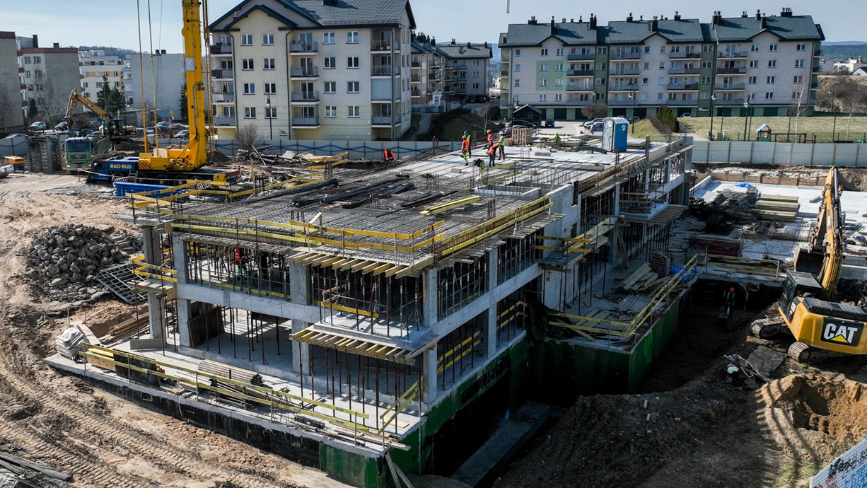 Fot.: UMK/Plac budowy przy ul. Puscha w Kielcach. Wykonawca zakończył prace nad halą garażową i drugą kondygnacją, osiągając blisko jedną trzecią zaplanowanych robót przy pierwszym z sześciu budynków KTBS.